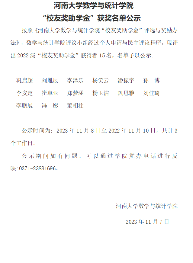 河南大学数学与统计学院 “校友奖助学金”获奖名单公示