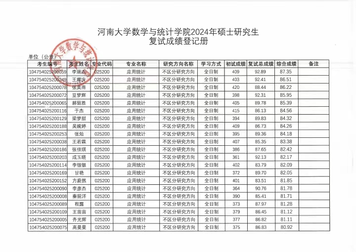 河南大学数学与统计学院2024年硕士研究生复试成绩登记册