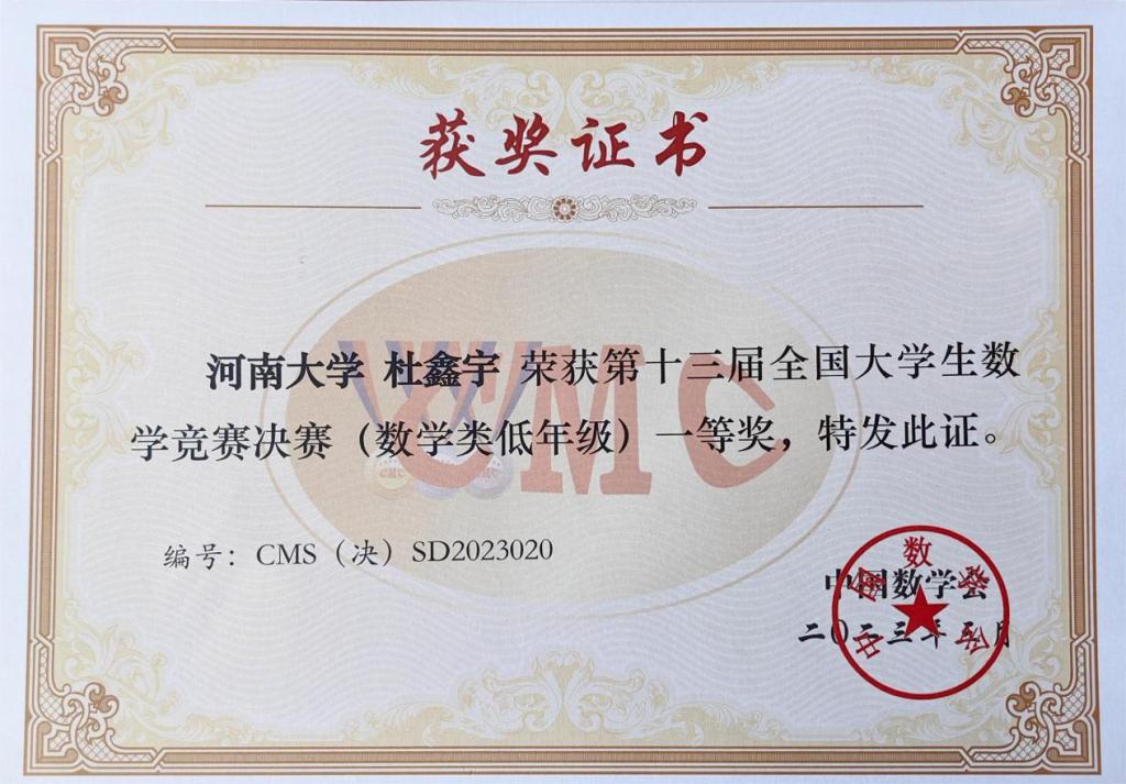 在本届竞赛中,数学与统计学院2018级数学与应用数学专业“明德计划”实验班(简称“实验班”)雷庆浩同学荣获数学专业高年级组一等奖,2020级实验班杜鑫宇同学荣获数学专业低年级组一等奖。目前,学院学子已累计获得专业组国家一等奖5项(我省学子累计获专业组国家一等奖8项)。2018级金融数学专业陈琦飞荣获数学专业组三等奖。欧亚学院2019级金融数学专业汤涵之荣获非数学专业组三等奖。