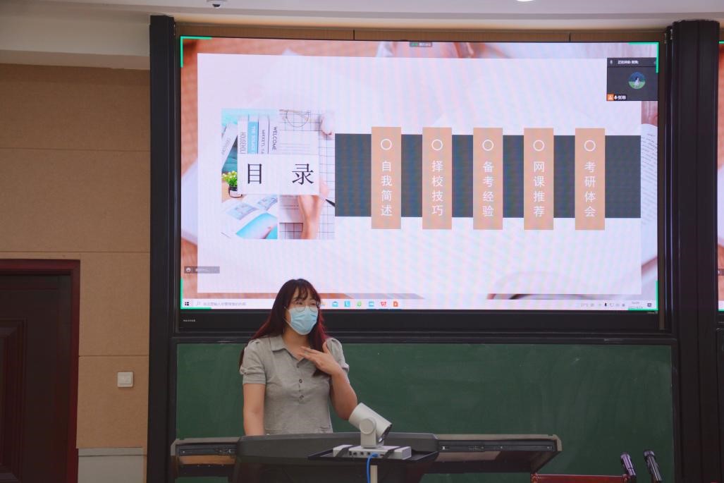 贾丽冰首先简单分析了当下考研的形势,回顾了学院近年的考研情况,鼓励同学们积极考研。她说到,此次交流会的目的是进一步提高同学们的考研热情,希望同学们认真聆听,能有所收获,随后介绍了8名优秀学长学姐的基本情况。