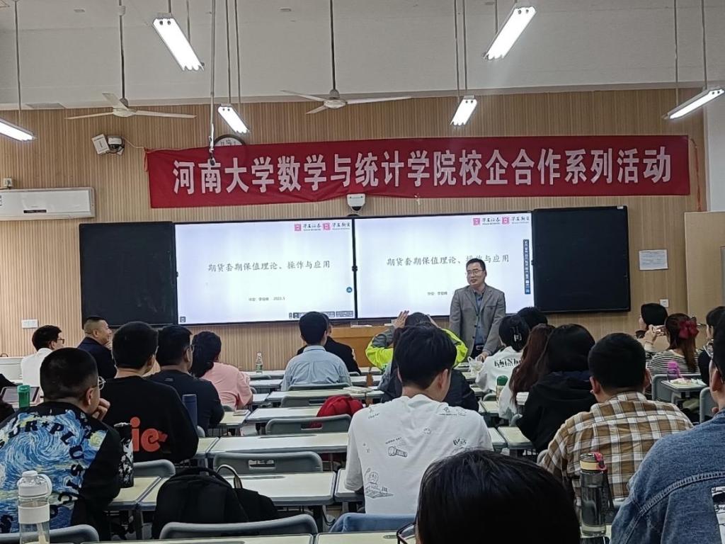 5月4日下午,华安期货区域总监李俊峰、华安证券商都路营业部营销总监单航涛、华安证券商都路营业部理财经理侯丹丹一行到河南大学数学与统计学院开展校企合作——行业知识培训活动,在金明综合楼3103教室为金融数学专业学生做了一场题为《期货套期保值的理论、操作及应用》的精彩讲座。学院副院长解俊山、金融数学系主任张嘉防、金融数学系教师何妍等60余名师生参加了活动。活动由何妍主持。