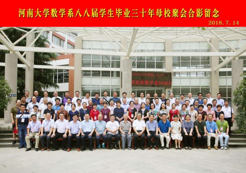 7月14日,河南大学数学系84级校友100余人荣归母校,在数学与统计学院举行座谈会,话师生情,叙同窗谊,庆祝毕业30周年。数学系84级班主任、校党委书记卢克平,数学系84级任课教师代表、原副校长田继善、郭天榜等出席会议。座谈会由数学系84级校友丁仲荐主持。